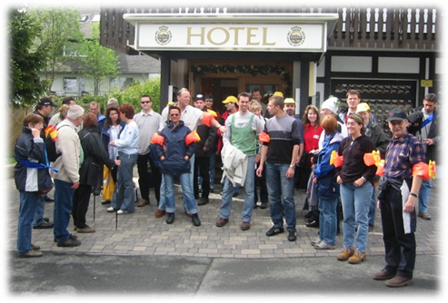 Gestärkt von einem guten sauerländischen Frühstück und noch ein wenig Restpromille vom Vorabend im Blut, war jetzt Teamgeist, Kreativität und auch ein bisschen Mut gefragt. Ausgestattet mit Schwimmärmchen, Leibchen, Schirmmützen und sonstigem Equipment, verschwanden die Teams im Wald gleich hinter dem Hotel. Nach einem ersten Anstieg waren bereits unterwegs die ersten Teamaufgaben zu bewältigen.